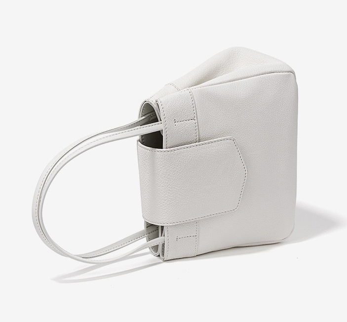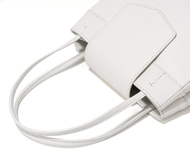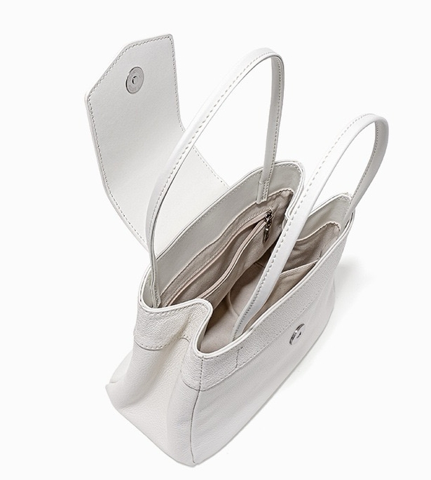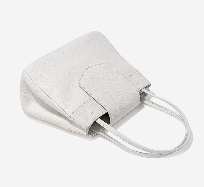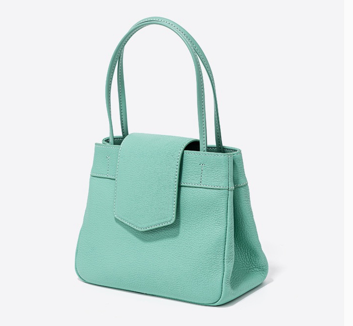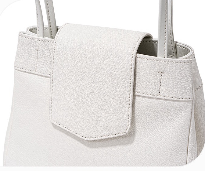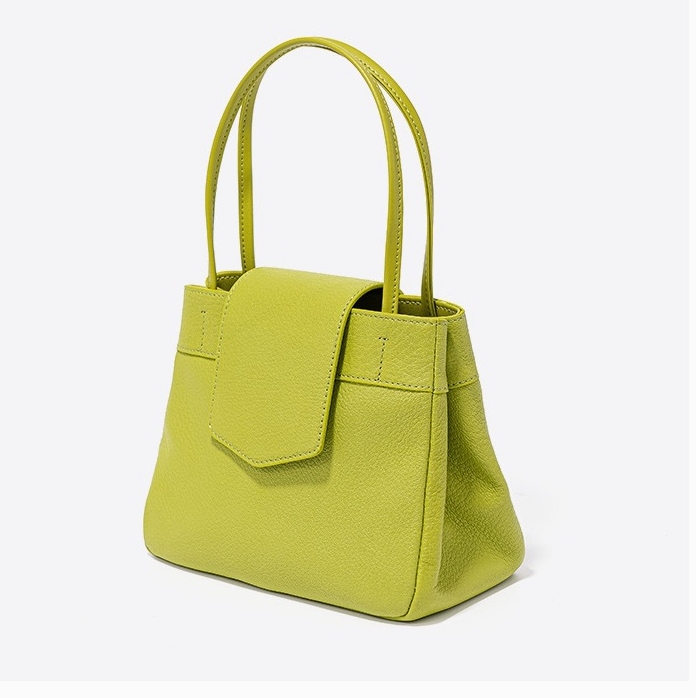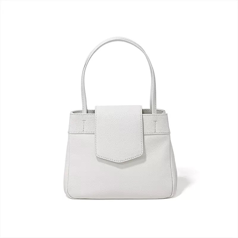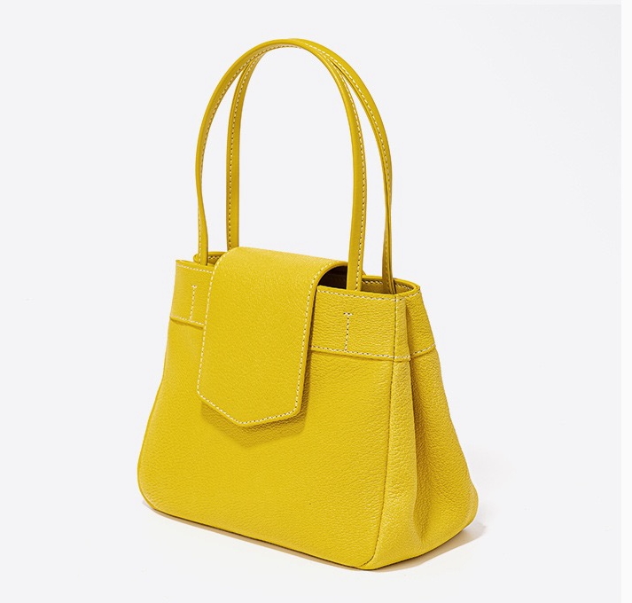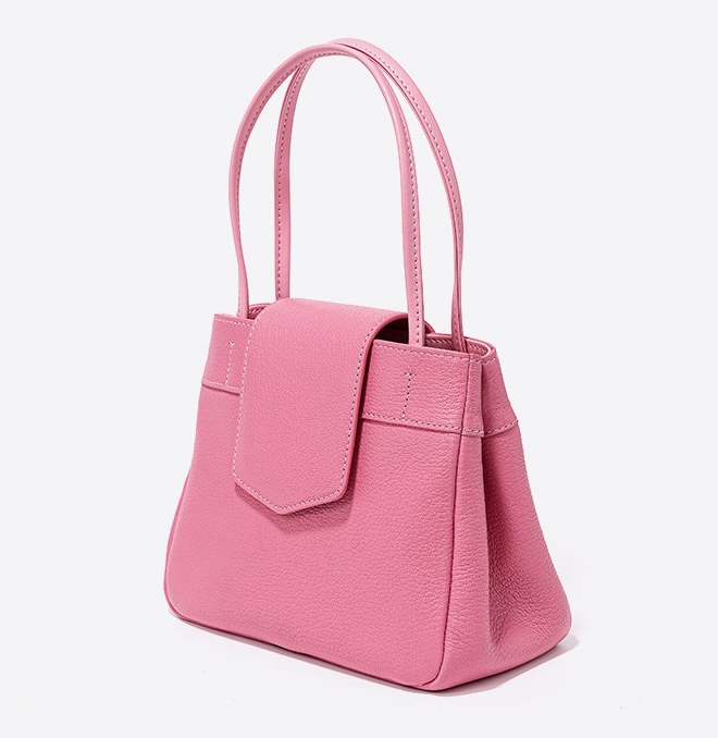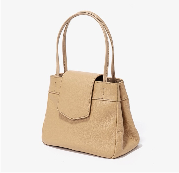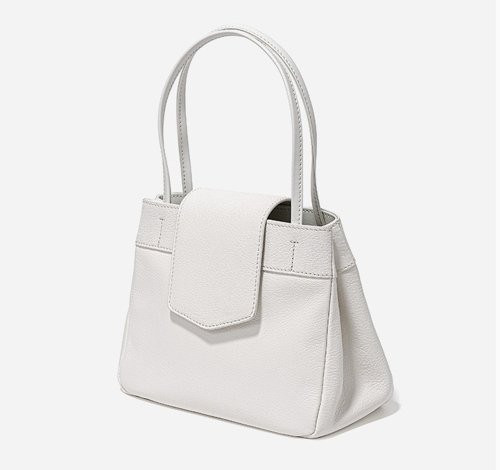 This bag has a simple shape, with a trapezoidal body, top opening, with a flap design, featuring a double hand strap and smooth, sharp lines. The surface material appears to be fine leather, with a superior texture and exquisite craftsmanship.