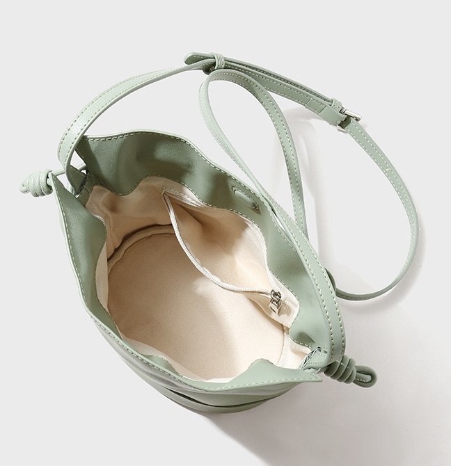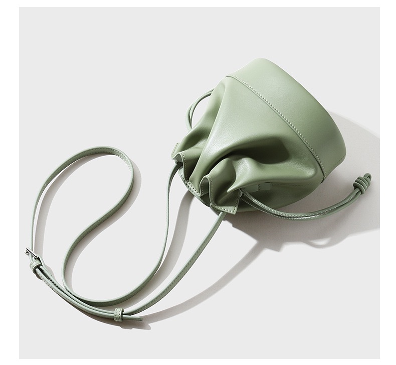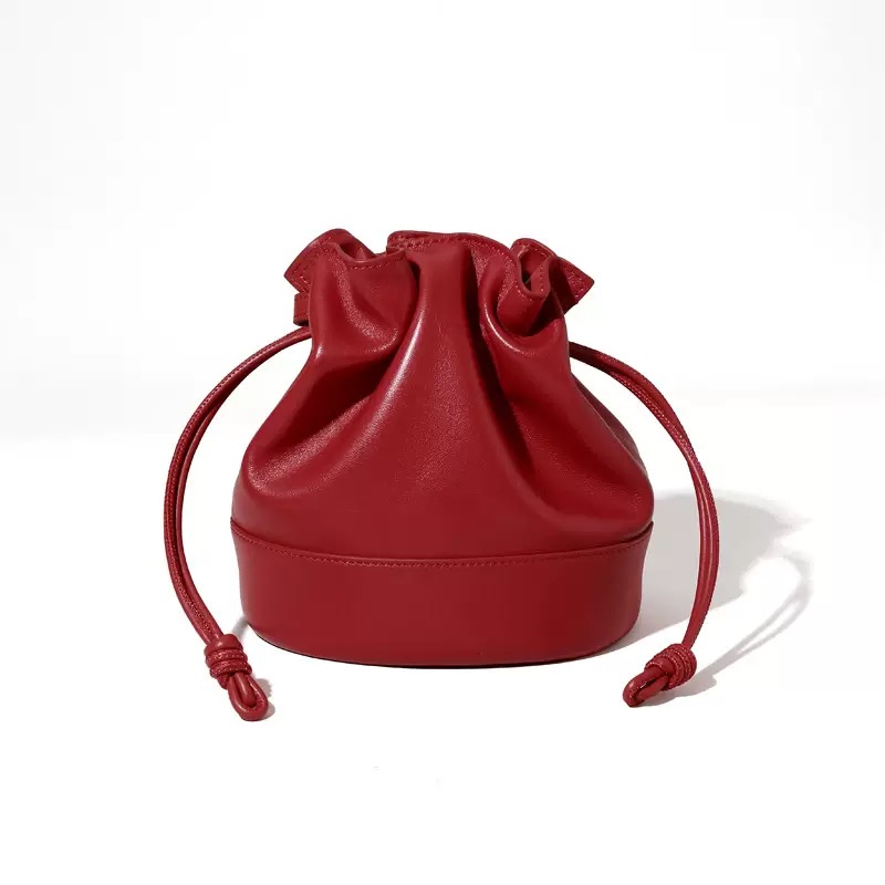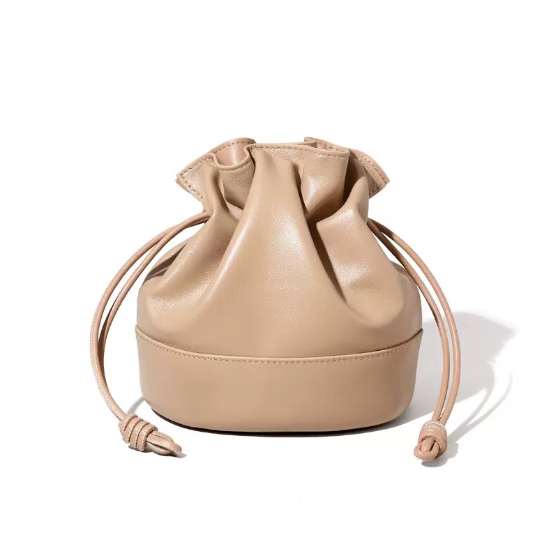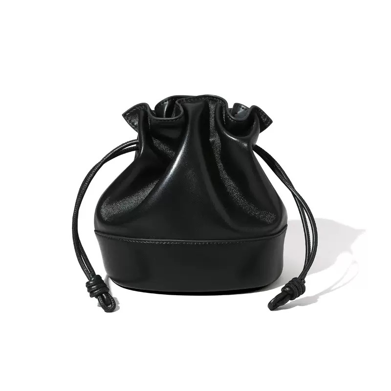 With a classic drawstring drawstring closure, this bag is lightweight and drapey, with a slightly wider, rounded cup shape at the bottom. The sides of the bag are fitted with thin drawstrings to adjust the size of the opening. Made of soft leather with a fine surface texture, it is simple yet stylish.